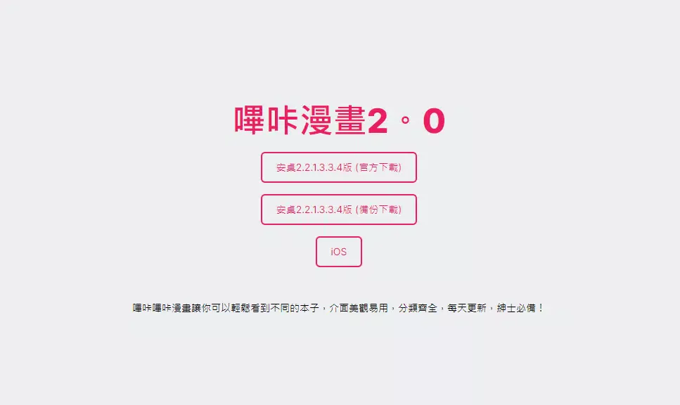 如上图所示,在官网中,我们可以看到哔咔漫画所提供的手机 App 下载渠道,包括 Android 与 iOS。其中安卓版的下载较为方便,点击任意一个安卓的下载按钮,即可自动下载 apk 文件进行安装,目前的最新版本号为 2.2.1.3.3.4。